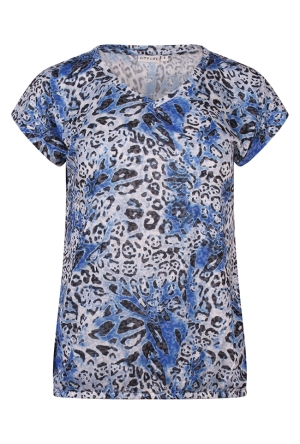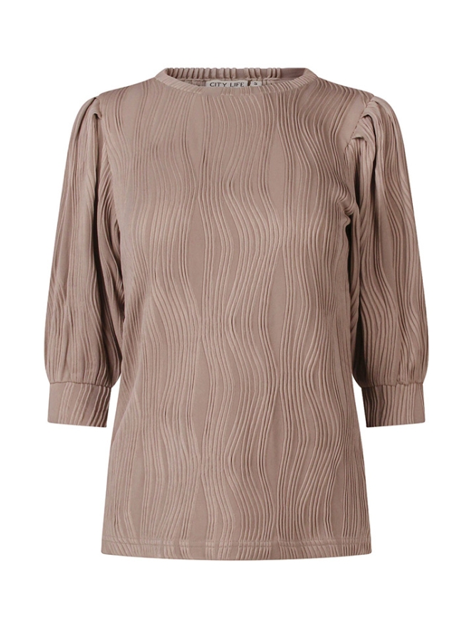 Dames shirt van jacquardstof met een elegant golfpatroon. Het shirt heeft pofmouwen en een klassieke ronde hals, voor een stijlvolle en vrouwelijke look.
