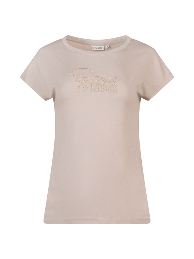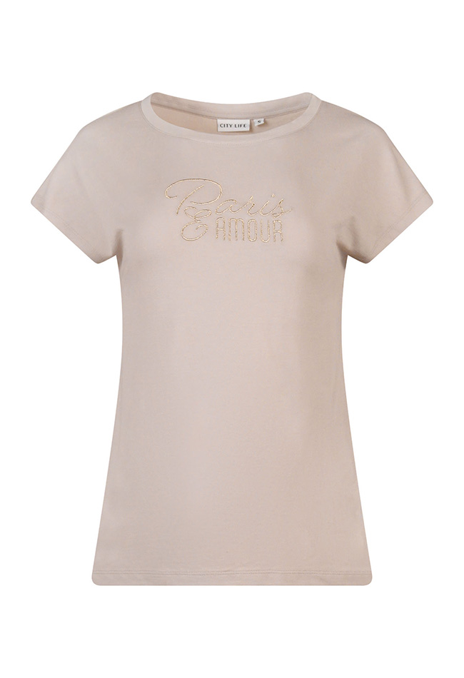 Comfortabel dames T-shirt van zachte modal sweatstof met een casual en moderne uitstraling. Het materiaal voelt soepel en aangenaam aan op de huid en biedt veel draagcomfort. Het subtiele tekst borduur geeft het shirt een stijlvolle en eigentijdse Touch. Perfect te combineren met een jeans, jogger of rok voor een relaxte en trendy look.
