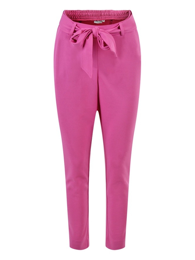 Deze pantalon is gemaakt van een rekbaar materiaal waardoor hij heerlijk draagt. De tailleband is gemaakt van elastiek en door de riemlussen zit een bijpassend strik ceintuur. Voor zit een bandplooi en steekzakken. Op de achterkant zitten twee nep strookzakken. Deze pantalon is verkrijgbaar in vijf kleuren en kan gecombineerd worden met een bijpassende blazer, artikelnummer: z70389.