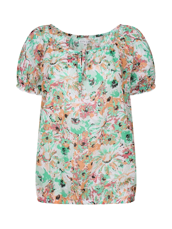 Top met korte mouwen en bloemen print, de voorkant van de hals kan gestrikt worden.