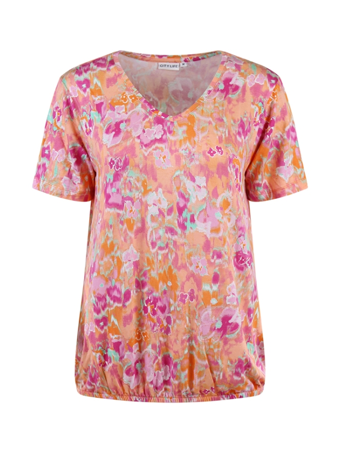 T-shirt met een allover aquarel bloemenprint. Het t-shirt heeft korte mouwen een V-hals en aan de onderkant van het t-shirt zit een elastiek.