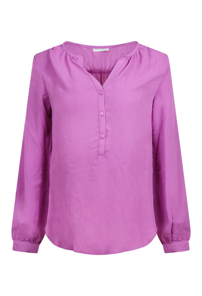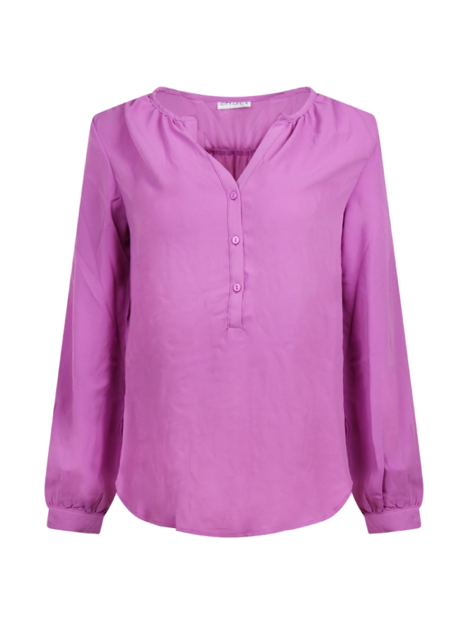 Blouse met lange mouwen, een V-hals en drie knopen aan de voorkant.