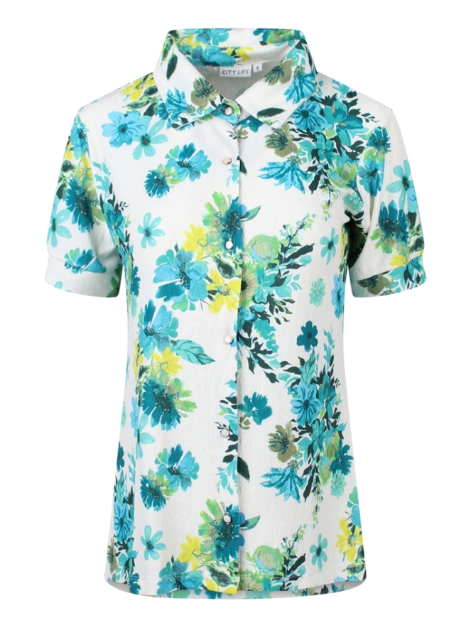 Deze blouse met korte mouw heeft een bloemenprint en parel look knoopjes.