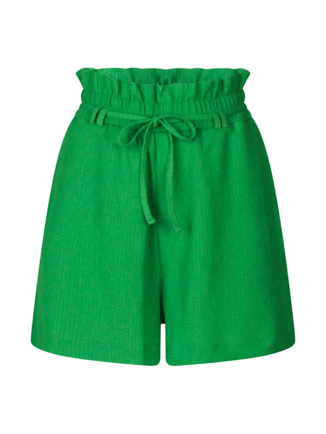 Deze short heeft een elastische tailleband met een strikceintuur. Boven de tailleband zit een ruche rand.
