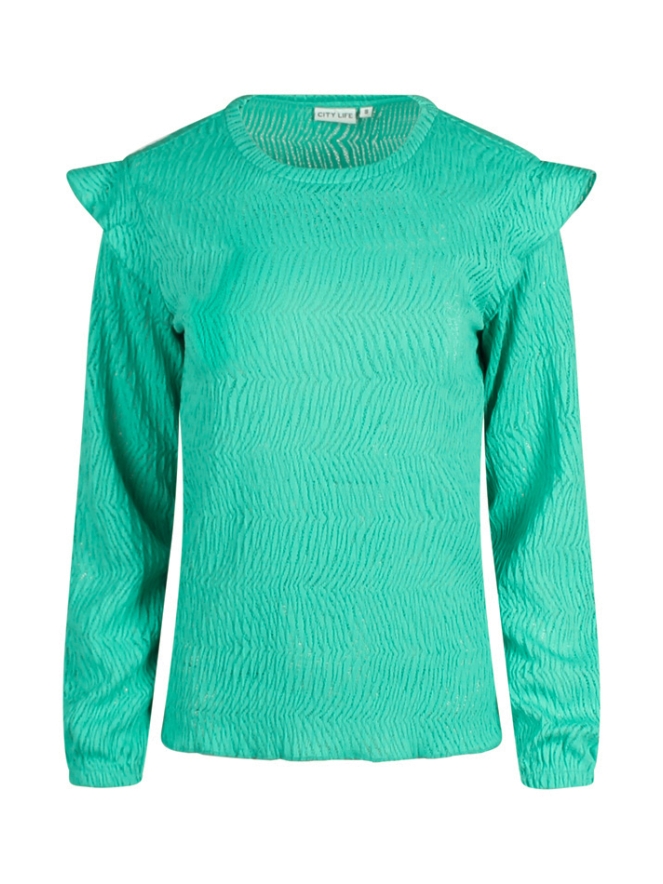 Deze top van ajour heeft een ronde hals met ruches op de schouder. Het uiteinde van de mouw heeft een elastiek.