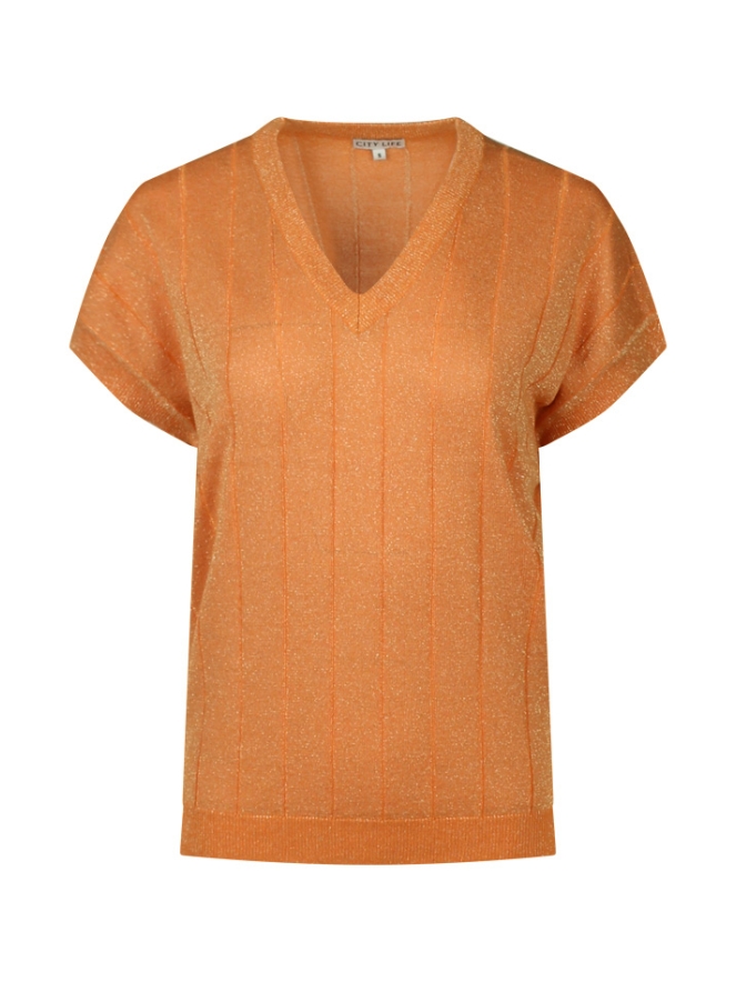 Deze top met glitter heeft een V hals, verticaal streep patroon in het breisel en een klein kapmouwtje.