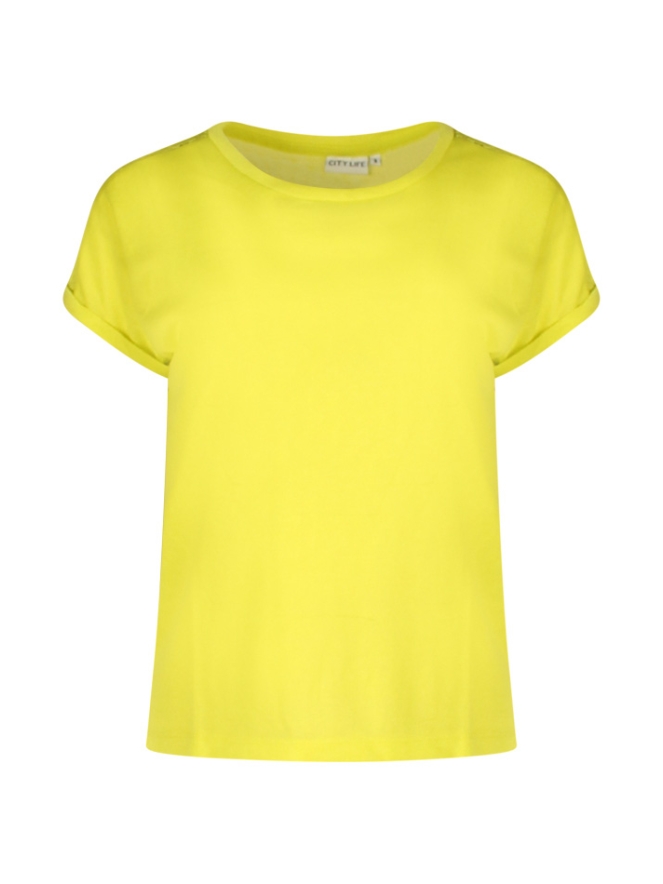 Dit licht doorschijnende shirt heeft een omslag mouw met over de schouder een sierlijke bies.