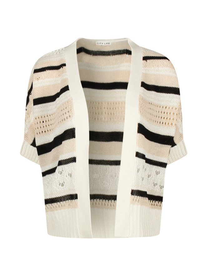 Vestje voor zomerse dagen met een korte vleermuismouw. Op subtiele wijze zit er een lurex glitterdraad door het vestje verweven met streeppatroon.