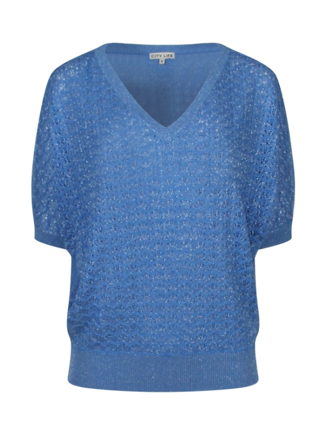 Deze top met vleermuismouw heeft een allover glitterdraad door de stof. Met een V hals. Leuk te dragen op rokken of jeans.
