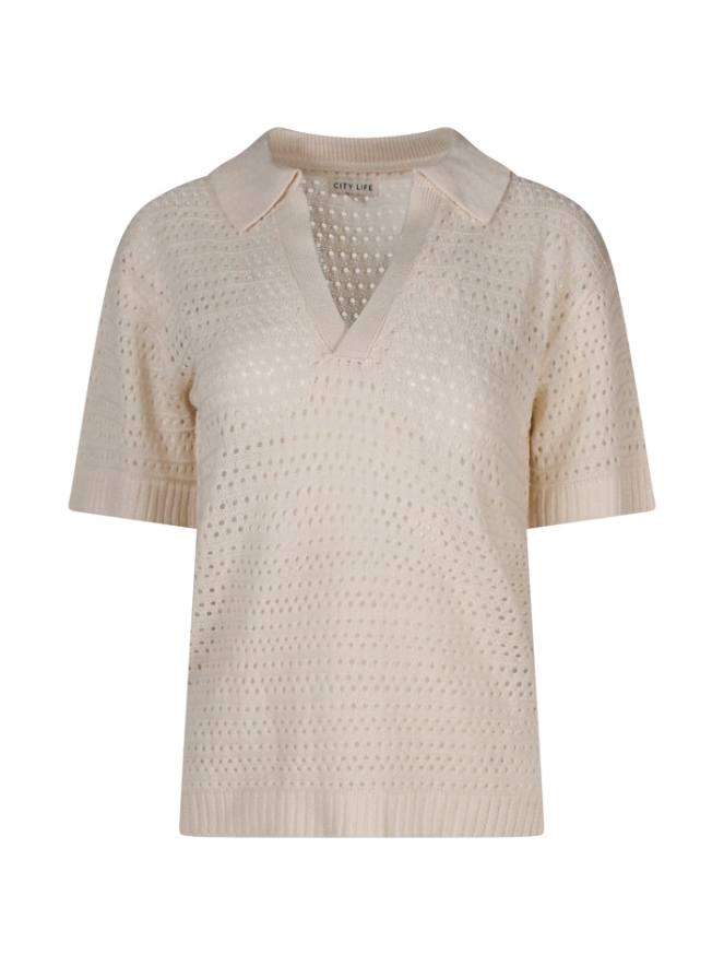 Luchtige dames trui met korte mouwen van open ajour breisel. Advies om er een singlet onder te dragen om doorschijnen te voorkomen. Effen gekleurd.