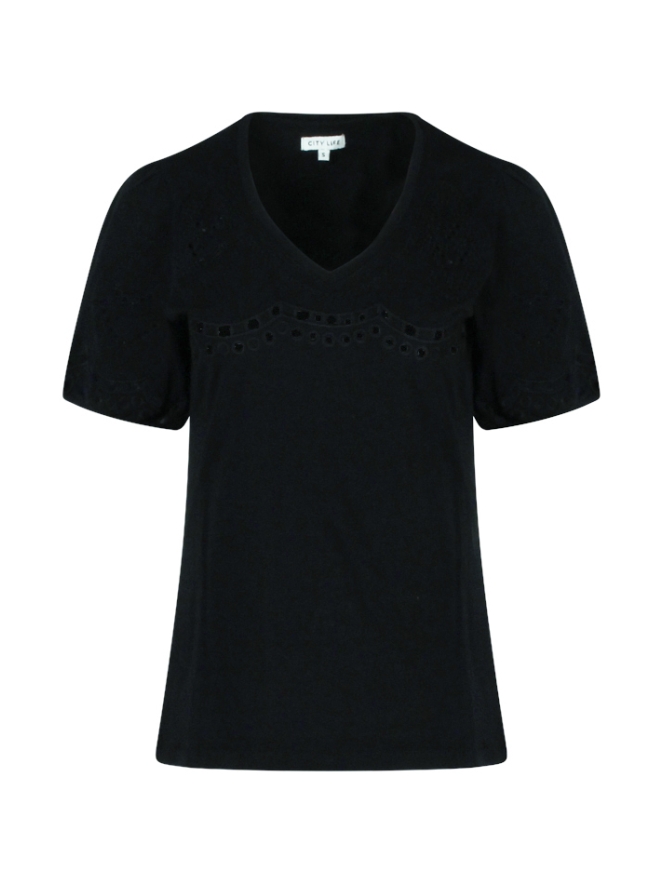 Dit T-shirt met pofmouwen heeft een opengewerkt borduurmotief. Leuk op een korte broek of rok. You go girl!