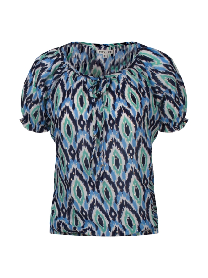 Deze dames top van Citylife valt op door het grafische dessin met subtiele folieprint, wat zorgt voor een stijlvolle glans. De strik bij de hals geeft een vrouwelijke touch, terwijl het elastiek in de mouwen en aan de onderkant zorgt voor een speelse pasvorm.