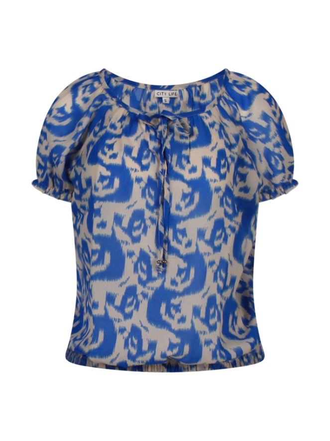 Deze luchtige chiffon top van Citylife is een zomerse blikvanger met een 2-kleurig ikatdessin in blauw-wit of zwart-wit. De ronde hals is afgewerkt met een charmant strikdetail bij de hals, wat zorgt voor een verfijnde touch. De korte raglanmouwen en de onderzijde van de top zijn voorzien van elastiek, wat zorgt voor een comfortabele pasvorm en een subtiel bloezend effect. Perfect te combineren met een jeans of linnen broek voor een stijlvolle en moeiteloze look tijdens warme dagen.