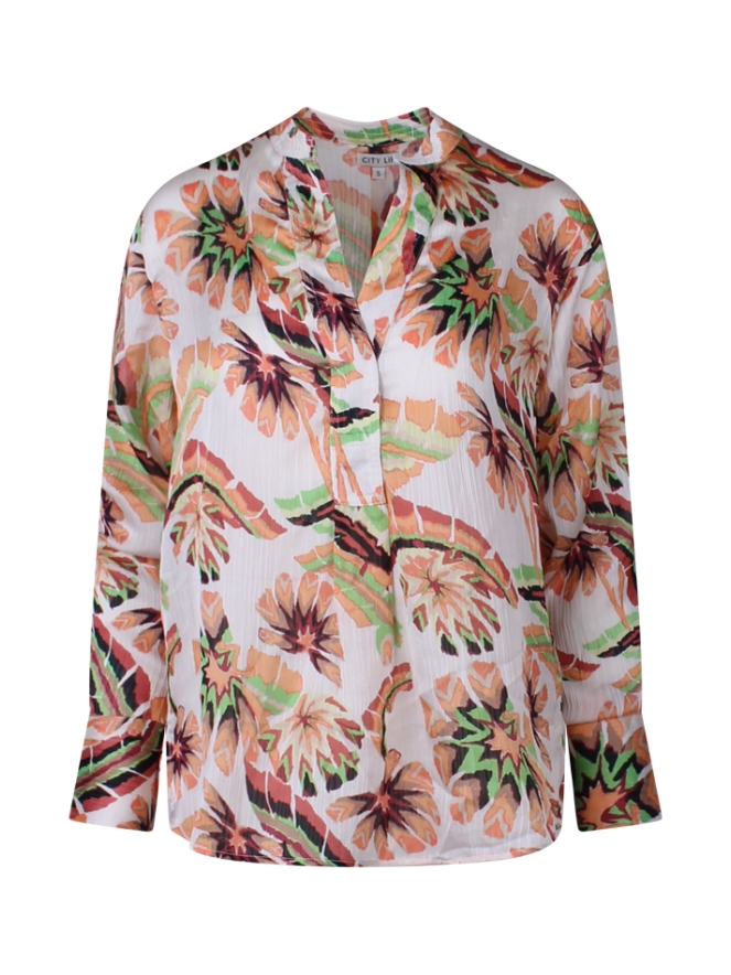 Deze elegante top van satin crinkle stof heeft een frisse multicolor bladprint die zorgt voor een levendige uitstraling. Met de V-hals en lange mouwen is het de ideale keuze voor zowel casual als geklede looks. Dankzij de lichte stof is deze top ook perfect voor de warmere dagen, waardoor stijl en comfort hand in hand gaan.