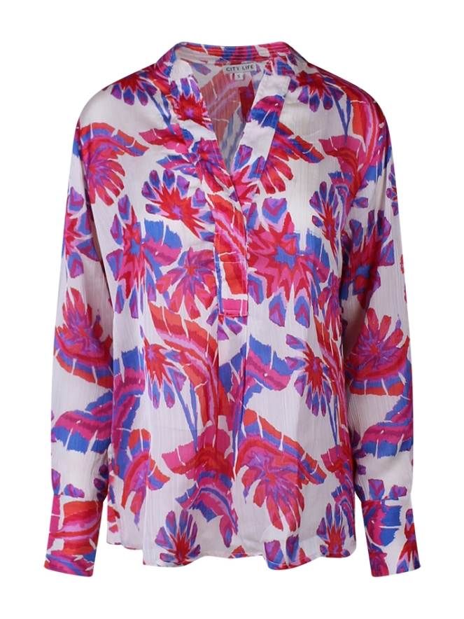 Deze elegante top van satin crinkle stof heeft een frisse multicolor bladprint die zorgt voor een levendige uitstraling. Met de V-hals en lange mouwen is het de ideale keuze voor zowel casual als geklede looks. Dankzij de lichte stof is deze top ook perfect voor de warmere dagen, waardoor stijl en comfort hand in hand gaan.