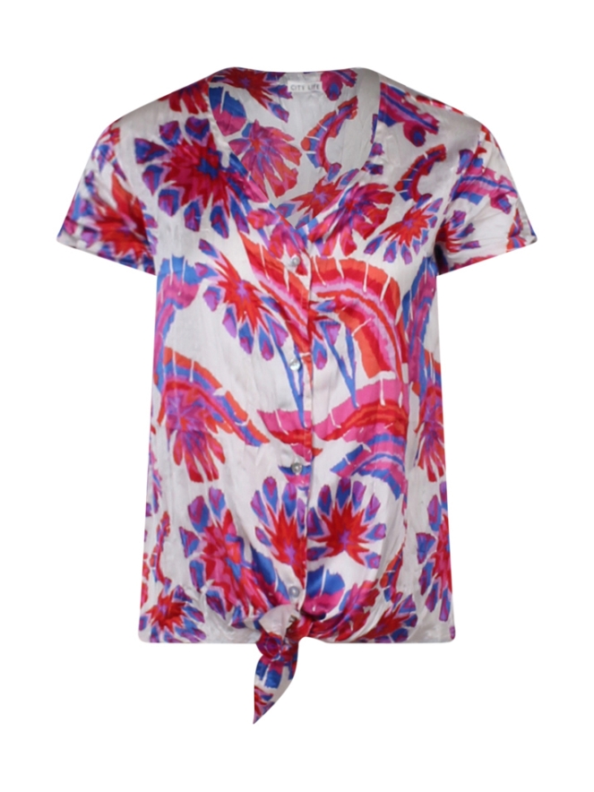 Deze elegante blouse is gemaakt van een crinkle satin stof en heeft een verfijnde bladprint. De V-hals en de knoopsluiting geven het een klassieke uitstraling, terwijl het strikdetail aan de onderkant zorgt voor een speelse, vrouwelijke touch.