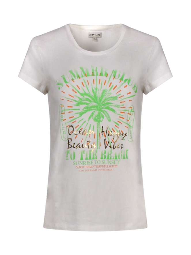Vrolijk T-shirt met grote print voorop. Leuk te dragen op een pantalon met blazer of gewoon heerlijk casual op je spijkerbroek.