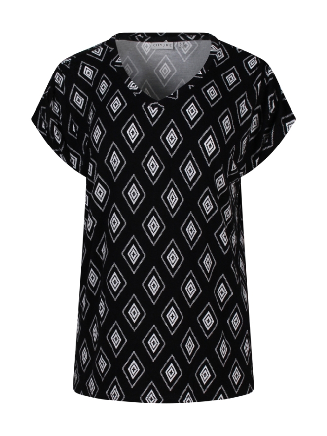 Vrolijk T-shirt met V hals en een leuke allover Ikat print. In dezelfde print is er ook een lange broek met fijne steekzakken verkrijgbaar onder art.nr. Z90594