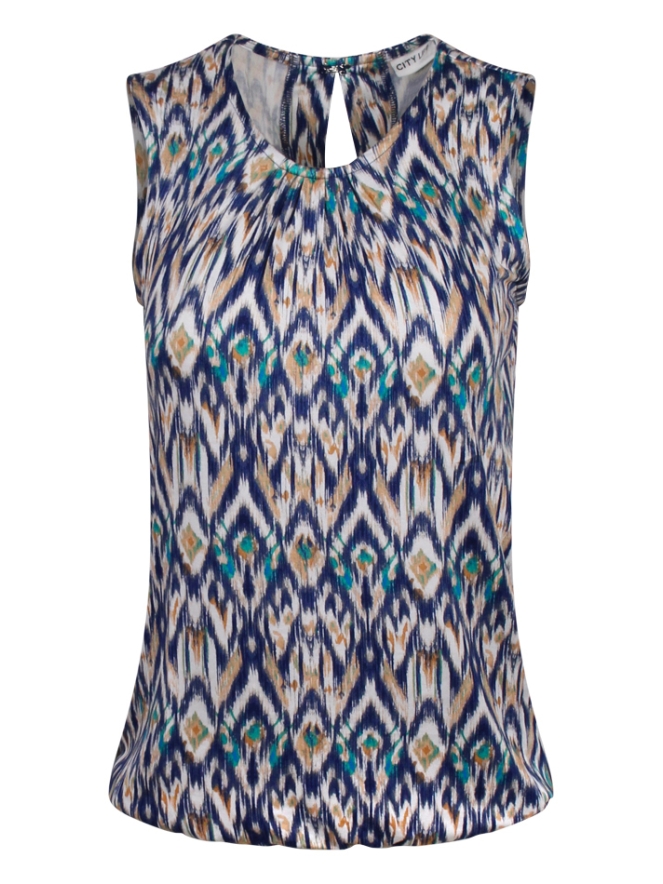 Deze singlets dragen heerlijk door de flexibele T-shirt stof. Op de rug zit een druppeluitsparen welke sluit met een kleine haaksluiting. Met kleurrijke ikatprint welke voor een casual sporty look perfect te combineren is met witte sneakers en een vlotte driekwart broek.
