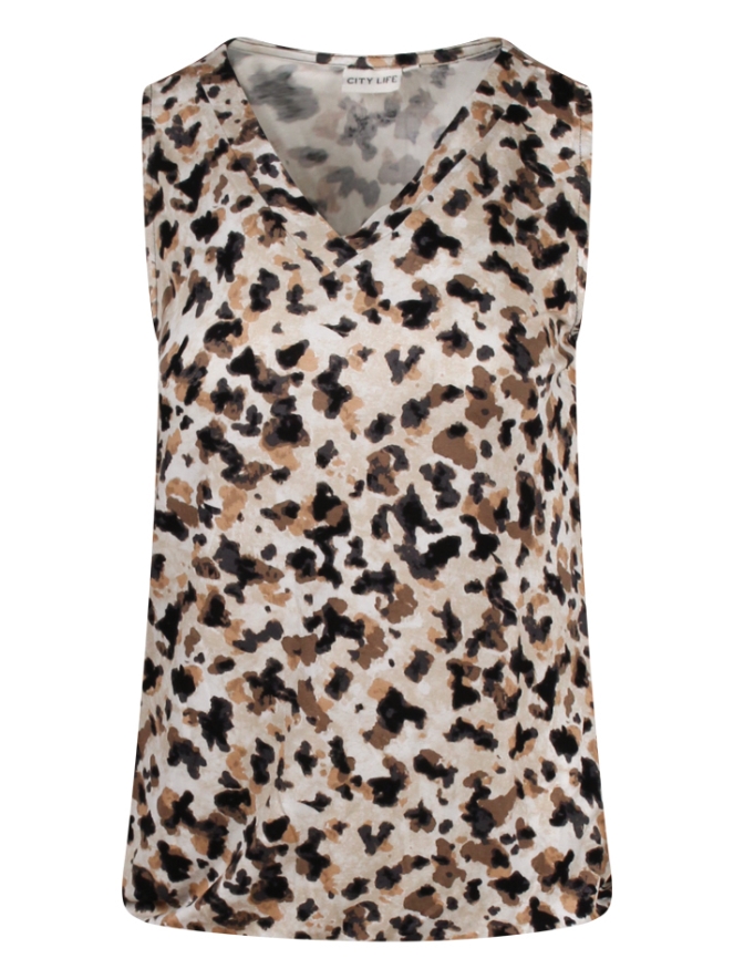 Deze mouwloze top van City Life is een must-have voor zomerse dagen! De vrouwelijke V-hals en het elastiek in de zoom zorgen voor een flatterend, blousend effect. Gemaakt van soepel vallende stof die licht en comfortabel aanvoelt, ideaal bij warm weer. De speelse dierenprint geeft een trendy touch. Perfect te combineren met een denim short voor een casual en stijlvolle zomerlook.