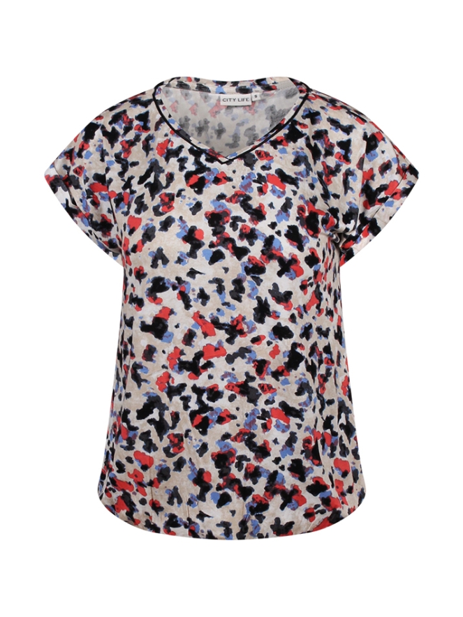 Dit shirt heeft een trendy vlekkendessin en een V-hals, wat het een casual, maar toch opvallende uitstraling geeft. Het elastiek aan de onderkant zorgt voor een comfortabele, gestructureerde fit.
