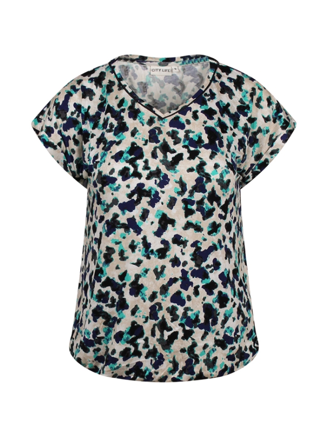 Dit shirt heeft een trendy vlekkendessin en een V-hals, wat het een casual, maar toch opvallende uitstraling geeft. Het elastiek aan de onderkant zorgt voor een comfortabele, gestructureerde fit.