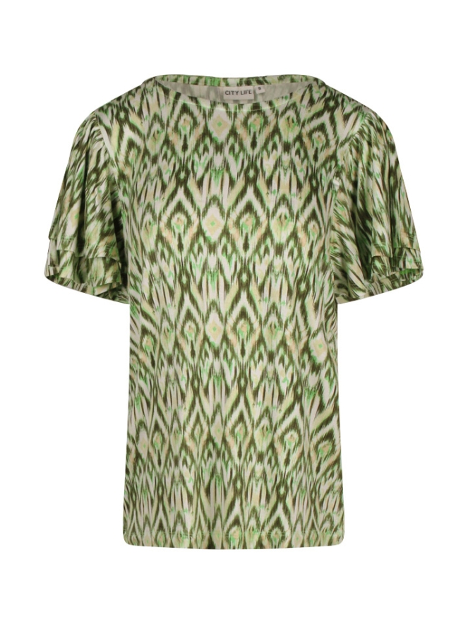 Vrolijk T-shirt met een prachtige vlindermouw. Dit shirt met meerkleurig Ikatpatroon houdt de Ikat trend nog even in ere! Draag hem op je jeans of nette pantalon en je bent ready to go!