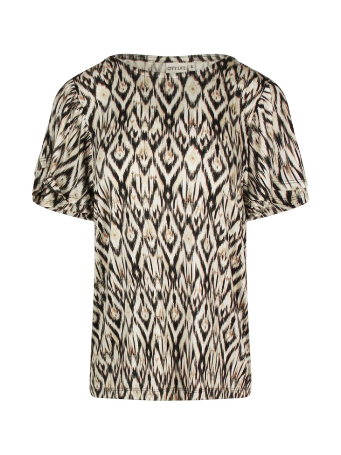 Vrolijk T-shirt met een prachtige vlindermouw. Dit shirt met meerkleurig Ikatpatroon houdt de Ikat trend nog even in ere! Draag hem op je jeans of nette pantalon en je bent ready to go!