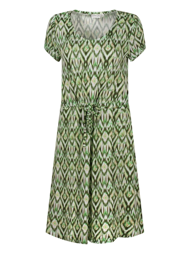 Deze damesjurk met trendy ikatdessin is een stijlvolle keuze voor zomerse dagen. In de taille zit een tunnel met een koordje, waarmee je de jurk mooi kunt tailleren. Het luchtige ontwerp zorgt voor extra draagcomfort.