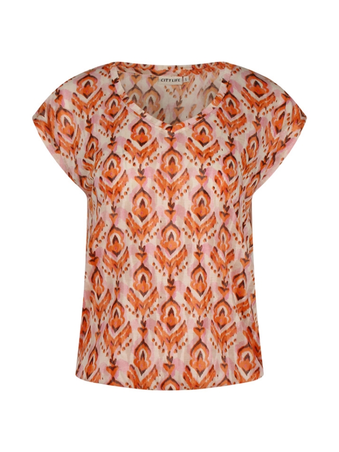 Dit luchtige T-shirt van Citylife uit de zomercollectie straalt comfort en stijl uit dankzij de bijzondere Ausbrenner kwaliteit en het trendy ikatdessin. De zachte kapmouwtjes en V-hals geven een vrouwelijke uitstraling, terwijl het elastiek onder in de band zorgt voor een mooie blousende fit. Een perfecte combinatie van nonchalante elegantie en zomerse flair ? ideaal om te dragen op een jeans, rok of short voor een relaxte, maar verzorgde look.