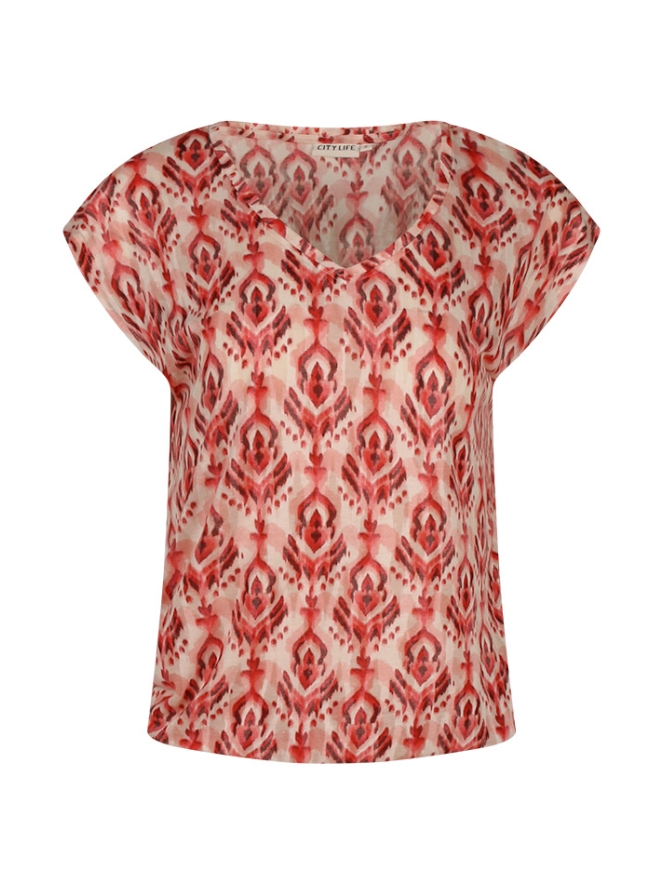 Dit luchtige T-shirt van Citylife uit de zomercollectie straalt comfort en stijl uit dankzij de bijzondere Ausbrenner kwaliteit en het trendy ikatdessin. De zachte kapmouwtjes en V-hals geven een vrouwelijke uitstraling, terwijl het elastiek onder in de band zorgt voor een mooie blousende fit. Een perfecte combinatie van nonchalante elegantie en zomerse flair ? ideaal om te dragen op een jeans, rok of short voor een relaxte, maar verzorgde look.