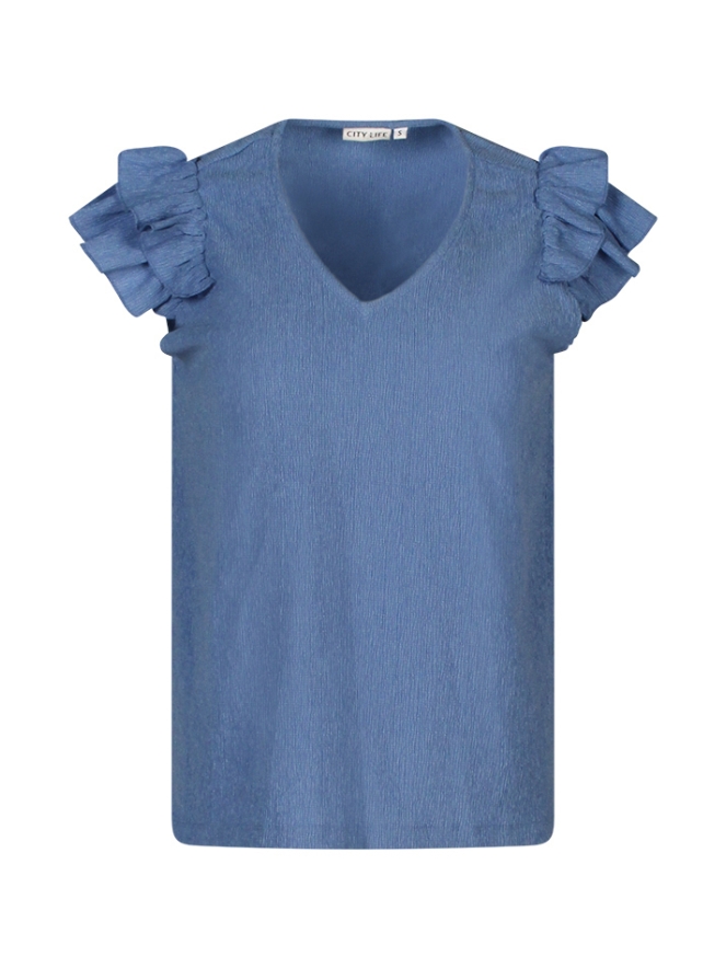 Deze luchtige top van crinkle stof heeft een elegante V-hals en subtiele ruches op de schouders voor een vrouwelijke touch. De top is ideaal voor zowel casual als feestelijke gelegenheden. Combineer hem met de bijpassende broek (z90694) voor een stijlvolle look, of draag hem met een denim short voor een relaxte, zomerse uitstraling.