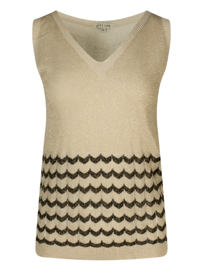 Dit mouwloze singlet van Citylife uit de zomercollectie is een echte eyecatcher dankzij het verfijnde zigzagdessin in lurex fijnbrei. De mix van katoen met metallic garen geeft het topje een subtiele glans en een elegante uitstraling, perfect voor zonnige dagen of een avondje uit. De V-hals zorgt voor een vrouwelijke touch, terwijl het luchtige materiaal comfortabel draagt tijdens warme temperaturen. Stijlvol én zomers: dit singlet is een sprankelende aanvulling op je garderobe.
