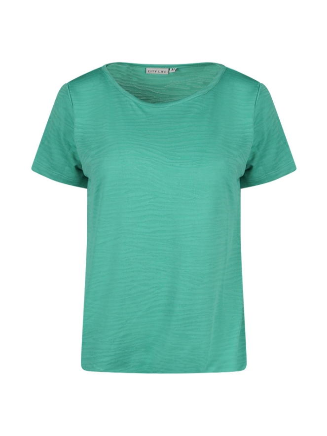 Dit T-shirt is licht doorschijnend door het fijne zebra motief in de stof. Dit shirt kan je in de taille laten bollen omdat er een elastiek in zit. Leuk te dragen onder een blazer maar mag zo gewoon op een rok of broek ook zeker gezien worden!