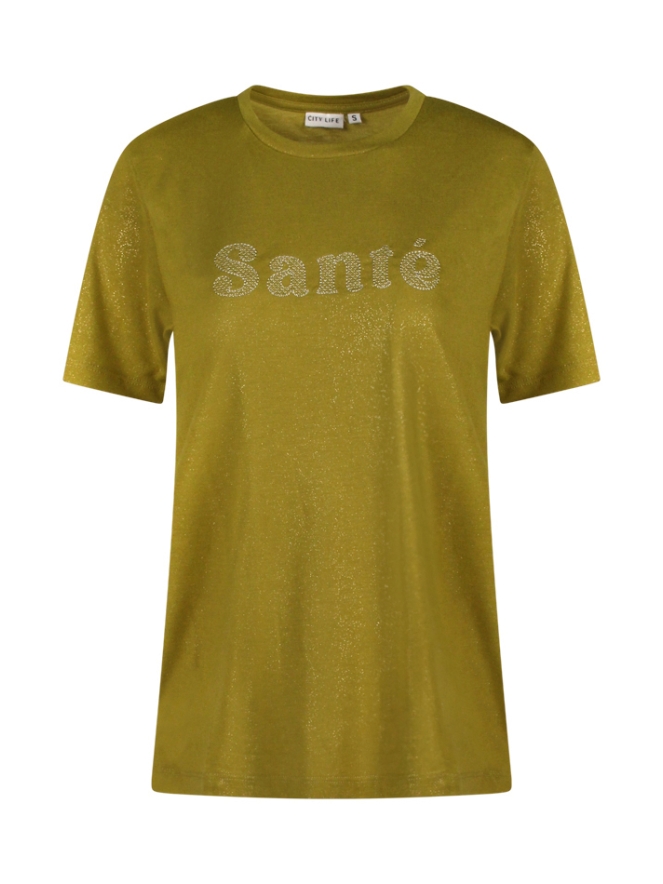 Dit dames t-shirt van City Life is een echte eyecatcher! Het shirt heeft een subtiele glans en is voorzien van de geborduurde tekst "Santé" op de borst. Dankzij de comfortabele pasvorm en zachte stof is het perfect voor zowel een casual als feestelijke look. Combineer het met een jeans of rok voor een stijlvolle outfit met een vleugje glamour.
