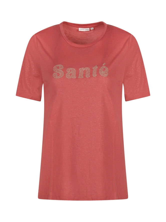 Dit dames t-shirt van City Life is een echte eyecatcher! Het shirt heeft een subtiele glans en is voorzien van de geborduurde tekst "Santé" op de borst. Dankzij de comfortabele pasvorm en zachte stof is het perfect voor zowel een casual als feestelijke look. Combineer het met een jeans of rok voor een stijlvolle outfit met een vleugje glamour.