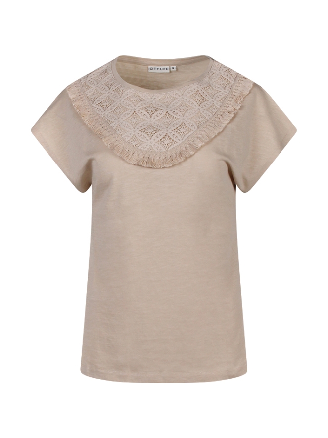Dit dames t-shirt van City Life is een perfecte mix van comfort en elegantie. De ronde hals is afgewerkt met een prachtig gehaakt patroon en subtiele franjes, wat zorgt voor een speelse en vrouwelijke uitstraling. Het shirt is gemaakt van een comfortabele, soepele stof en is verkrijgbaar in meerdere kleuren. Draag het casual op een jeans of combineer het met een rok voor een meer geklede, stijlvolle look.