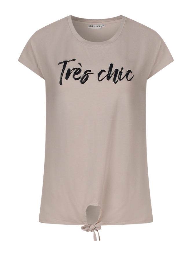 Trés chic! Basic shirtje met eenvoudige tekst en een leuke knoop in het shirtje. Leuk te dragen op rokken, lange broeken of korte broeken!