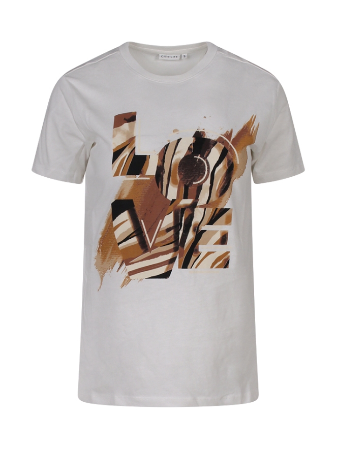 Dit dames t-shirt van City Life is een echte eyecatcher dankzij de grote "LOVE"-print op de voorkant in een mix van aardetinten en abstracte dierenprint. Het shirt is gemaakt van een zachte, comfortabele stof en heeft een klassieke ronde hals en korte mouwen. Perfect om te combineren met een jeans of short voor een casual en stijlvolle look met een opvallend accent.