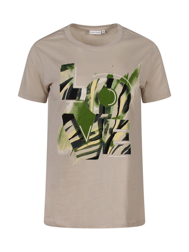 Dit dames t-shirt van City Life is een echte eyecatcher dankzij de grote "LOVE"-print op de voorkant in een mix van aardetinten en abstracte dierenprint. Het shirt is gemaakt van een zachte, comfortabele stof en heeft een klassieke ronde hals en korte mouwen. Perfect om te combineren met een jeans of short voor een casual en stijlvolle look met een opvallend accent.