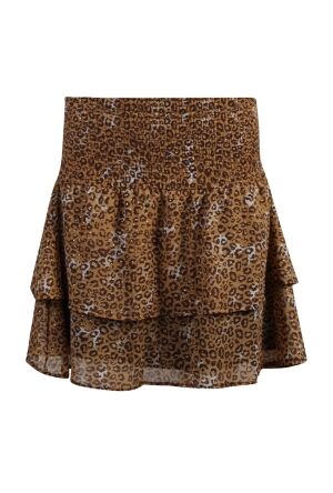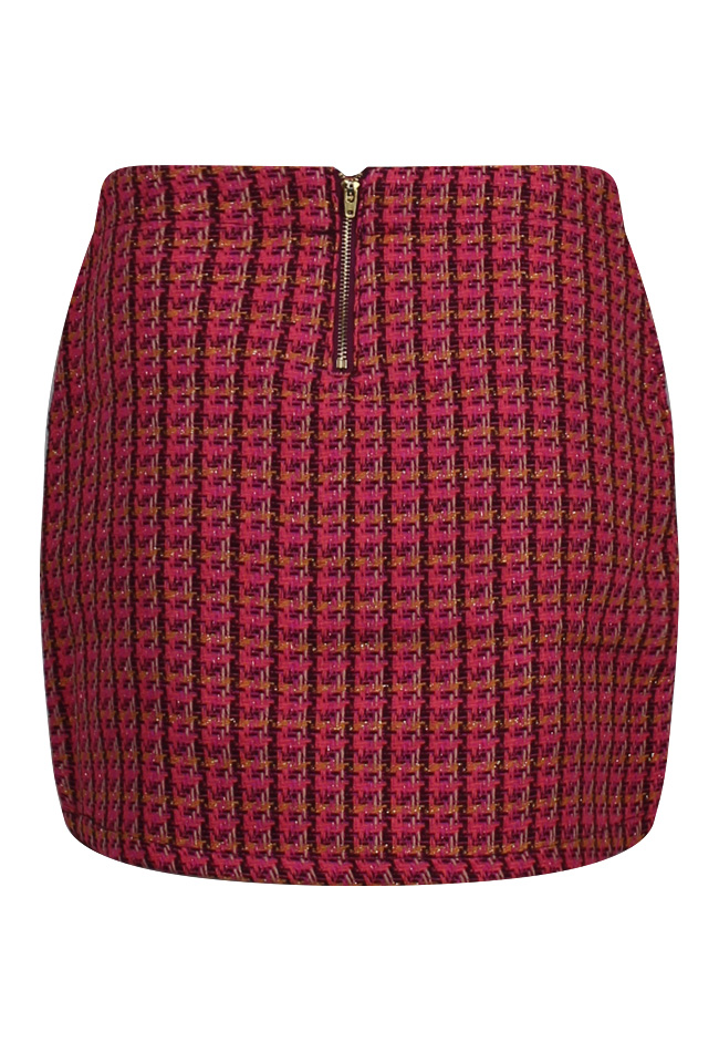 Geruit rokje gemaakt van tweed stof. Op het voorpand zitten twee rijen van 3 gouden sierknopen en een stoere speld met kettingen. De tailleband is voorzien van rits aan de achterkant.