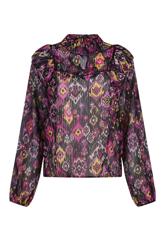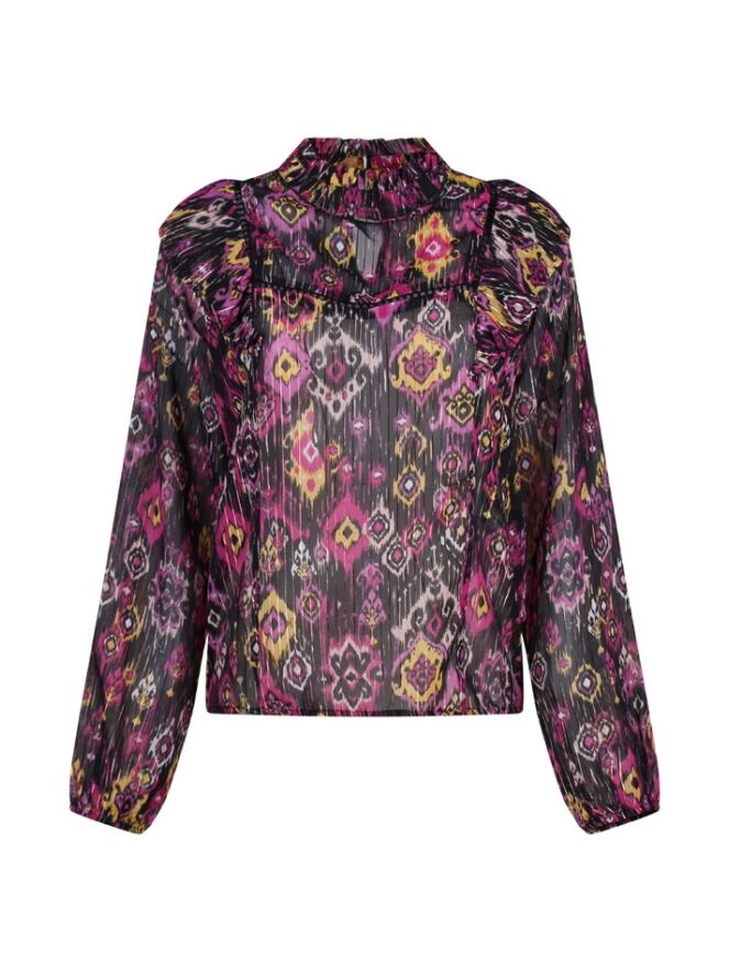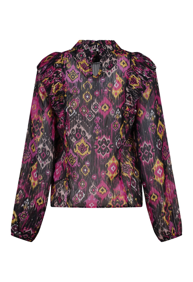Een blouse gemaakt van chiffon stof met ingeweven lurex draad en een ikat-print. Deze blouse heeft een opstaand kraagje met ruchedetail. De achterkant sluit met een knoopje en heeft een opening als detail. Langs de rug, schouders en borst loopt een ruchedetail, en de voorkant is versierd met kanten tape. Onder aan de mouwen zit elastiek voor een aansluitende pasvorm
