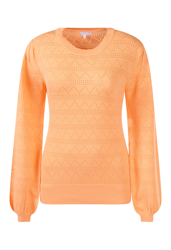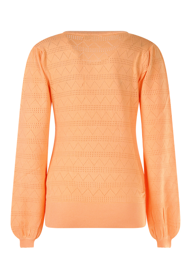 De pullover heeft een all over ajour brei patroon en ballon mouwen. De mouwen en hals hebben een sculp randje.