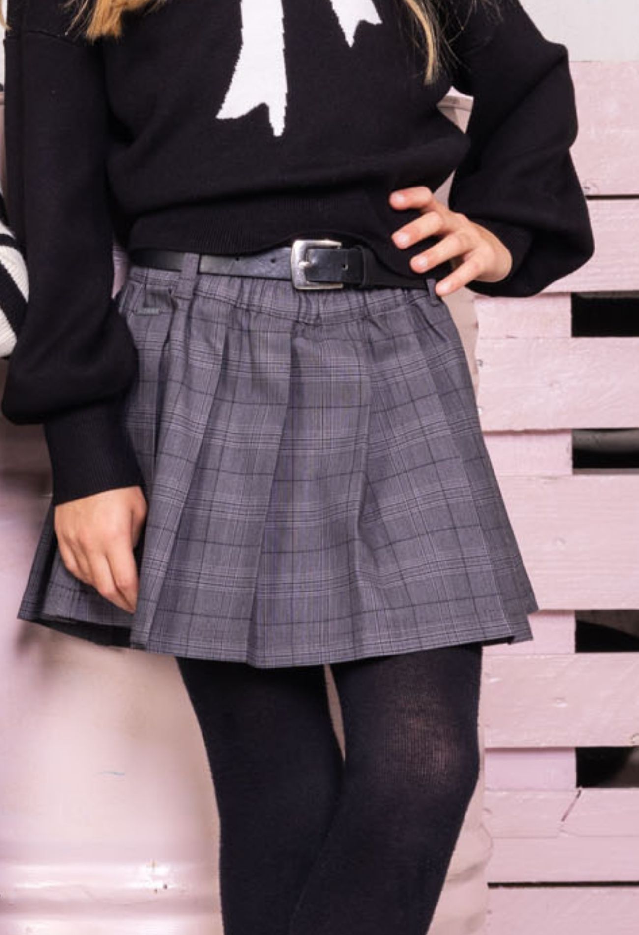High school look-a-like plooirokje van een mooie geruite stof met een zwarte kunstof riem. Leuk te combineren met sweaters en truien. Zwarte legging eronder met een leuk laarsje en je heb een leuke college look!