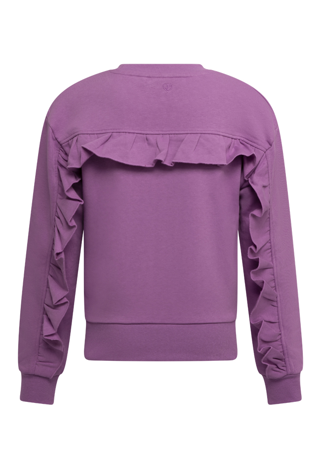 Mooie sweater met twee stud hearts voorop en een mooie ruche lopend over het gehele achterpand. Lekker trendy en super leuk te combineren met rokjes of jeans.