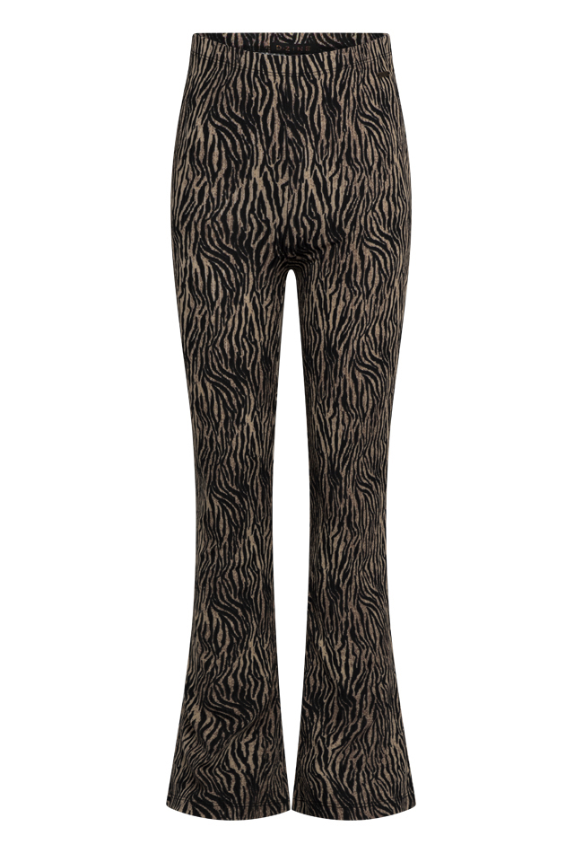 Trendy meisjes flair broek van D-zine, uitgevoerd in een comfortabele polyester/elastaan ribkwaliteit. De ene broek heeft een panter print, de andere broek een zebra print. De broek heeft een aansluitende pasvorm aan de bovenkant en loopt wijd uit in een flairmodel. Dankzij de elastische tailleband sluit de broek mooi aan en draagt hij extra comfortabel. De broek is te combineren met een bijpassende top in dezelfde print.