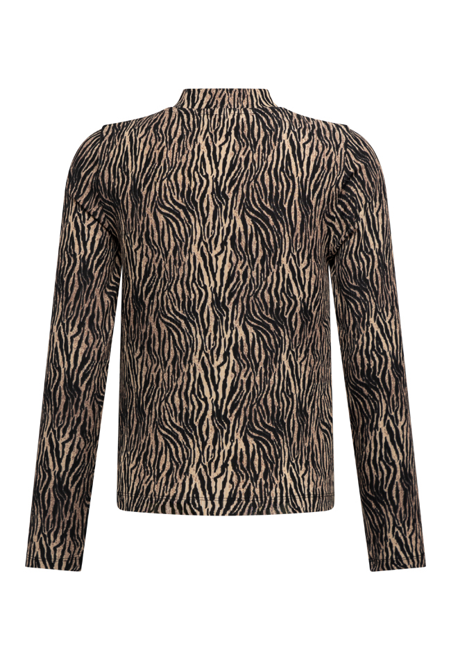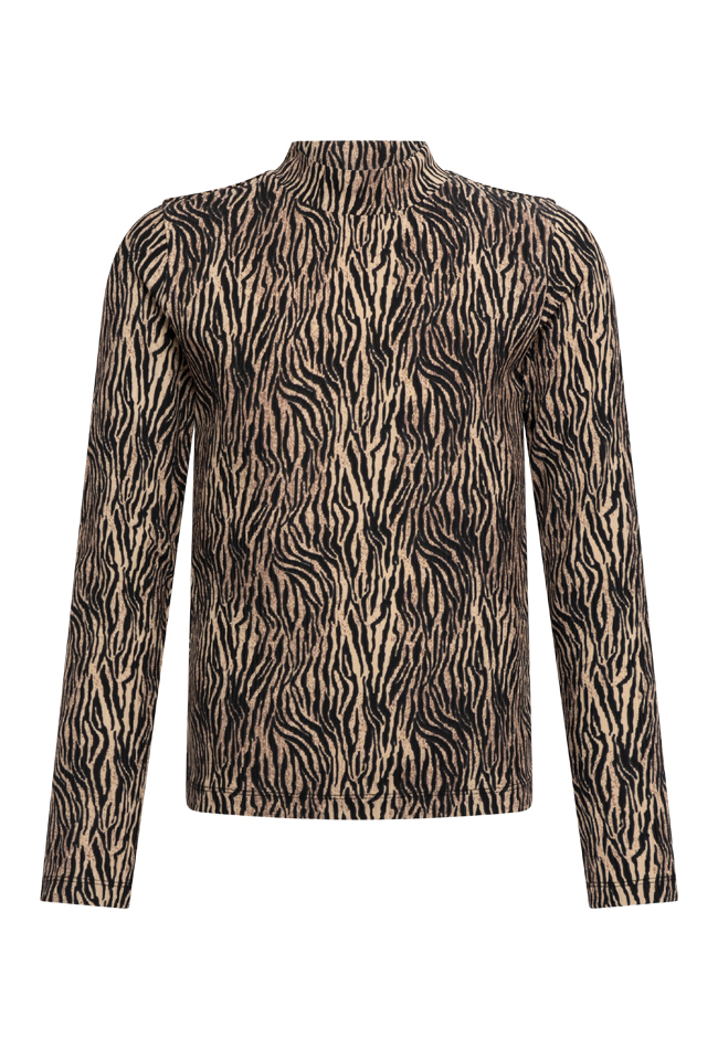 Trendy meisjes top van D-zine, uitgevoerd in een comfortabele polyester/elastaan ribkwaliteit met een opvallende all-over print. Verkrijgbaar in zowel panterprint als zebraprint. De top heeft een turtleneck en lange mouwen en is afgewerkt in een aansluitende fit. Perfect te combineren met de bijpassende flair broek in dezelfde print voor een complete set.