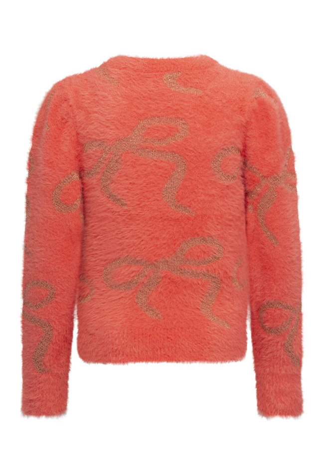 Deze meisjestrui is gemaakt van zachte featheryarn en heeft een speels all-over strikdessin. In de strikken is een subtiel lurexdraadje verwerkt, wat zorgt voor een feestelijke sparkle zonder te overdrijven. De rest van de trui is heerlijk zacht en comfortabel. Perfect te combineren met een rokje voor een girly look of met een jeans voor een fijne, casual outfit.