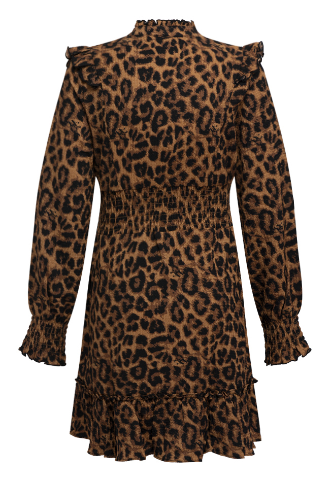 Stijlvolle meisjes jurk van D-zine, uitgevoerd in een soepele polyester/elastaan crêpe kwaliteit. De jurk is verkrijgbaar in drie varianten: panterprint, zebraprint en bloemenprint. Het model heeft een smockdetail rond de taille en bij de mouwen, waardoor de jurk mooi aansluit en comfortabel draagt. De speelse ruches over de borst en schouders geven de jurk een vrolijke uitstraling, terwijl de ruche rand onderaan de rok zorgt voor een zwierig effect. Een eigentijds item dat zowel stoer als girly gecombineerd kan worden.