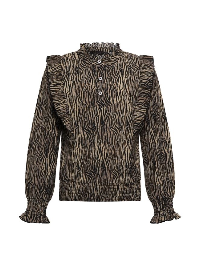 Stijlvolle meisjes blouse van D-zine, uitgevoerd in een soepele polyester/elastaan crêpe kwaliteit. De jurk is verkrijgbaar in drie varianten: panterprint, zebraprint en bloemenprint. Het model heeft een smockdetail bij de boorden. De speelse ruches over de borst en schouders geven de blouse een vrolijke uitstraling. Een eigentijds item dat zowel stoer als girly gecombineerd kan worden.